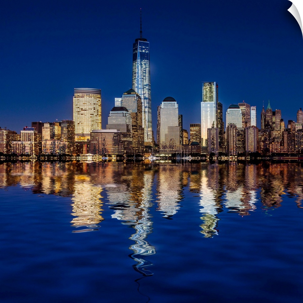<p>USA, New York City, Manhattan, Lower Manhattan, One World Trade Center, Freedom Tower, View from New Jersey towards Lower Manhattan, with the One World Trade Center, formerly Freedom Tower, at night.</p>