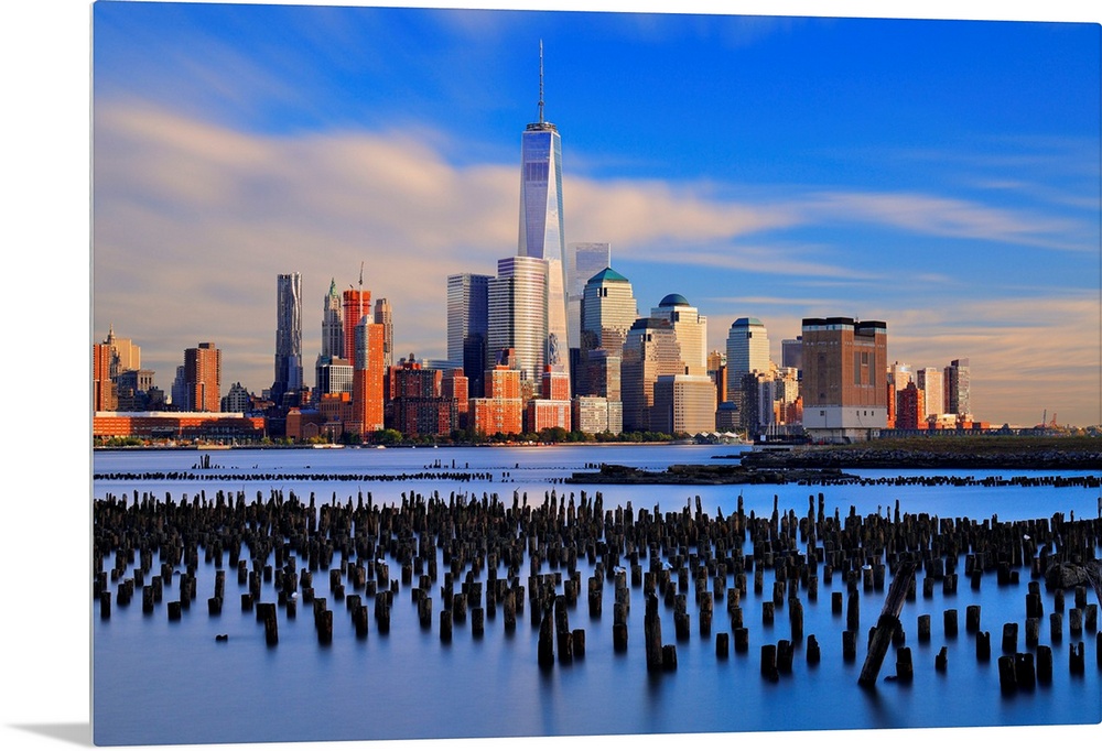 <p>USA, New York City, Manhattan, Lower Manhattan, One World Trade Center, Freedom Tower, View across the Hudson River of the Downtown Manhattan and Financial District skyline from New Jersey.</p>