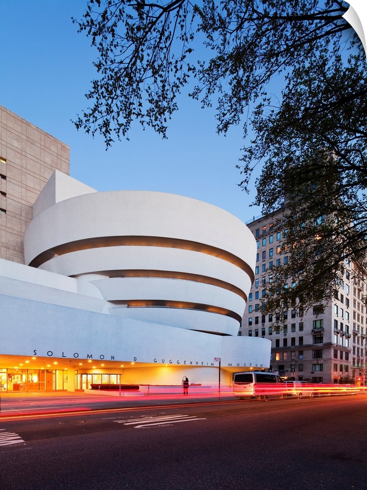 <p>USA, New York City, Manhattan, Upper East Side, Museum Mile, Guggenheim Museum, The museum designed by Frank Lloyd Wright illuminated at dusk.</p>