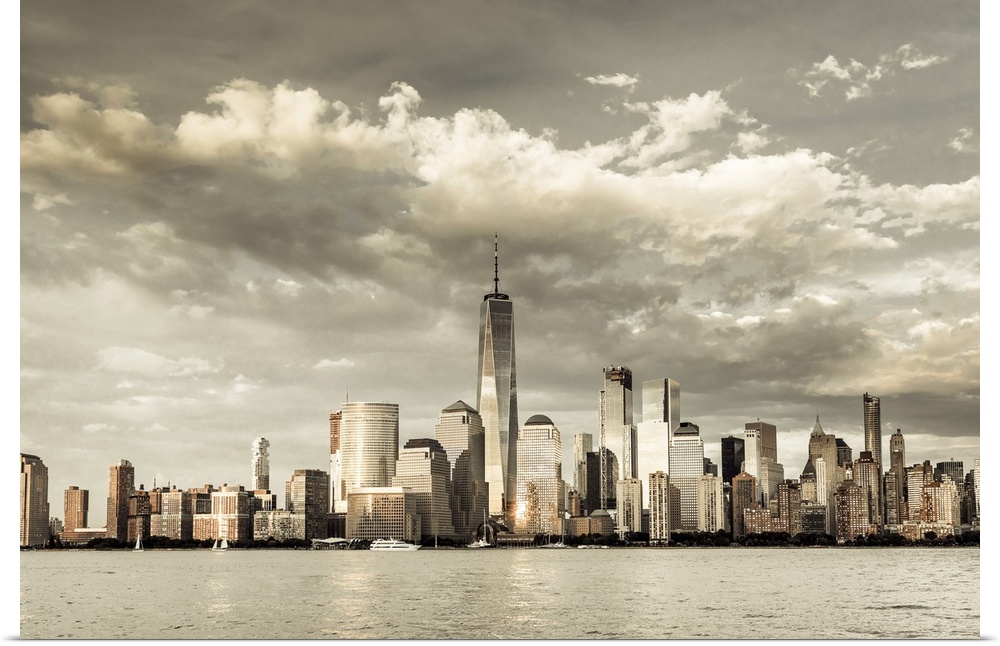 <p>United States, New York City, Manhattan, Lower Manhattan, One World Trade Center, Freedom Tower, View from New Jersey towards Lower Manhattan at sunset.</p>