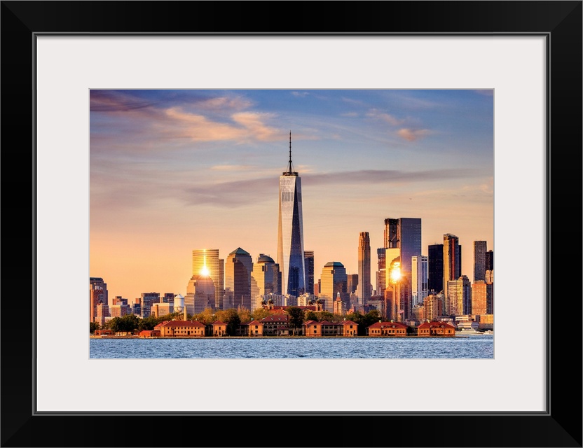 <p>USA, New York City, Manhattan, Lower Manhattan, One World Trade Center, Freedom Tower, The Ellis Island, view from New Jersey towards Lower Manhattan, with the One World Trade Center, with Freedom Tower, at sunrise.</p>