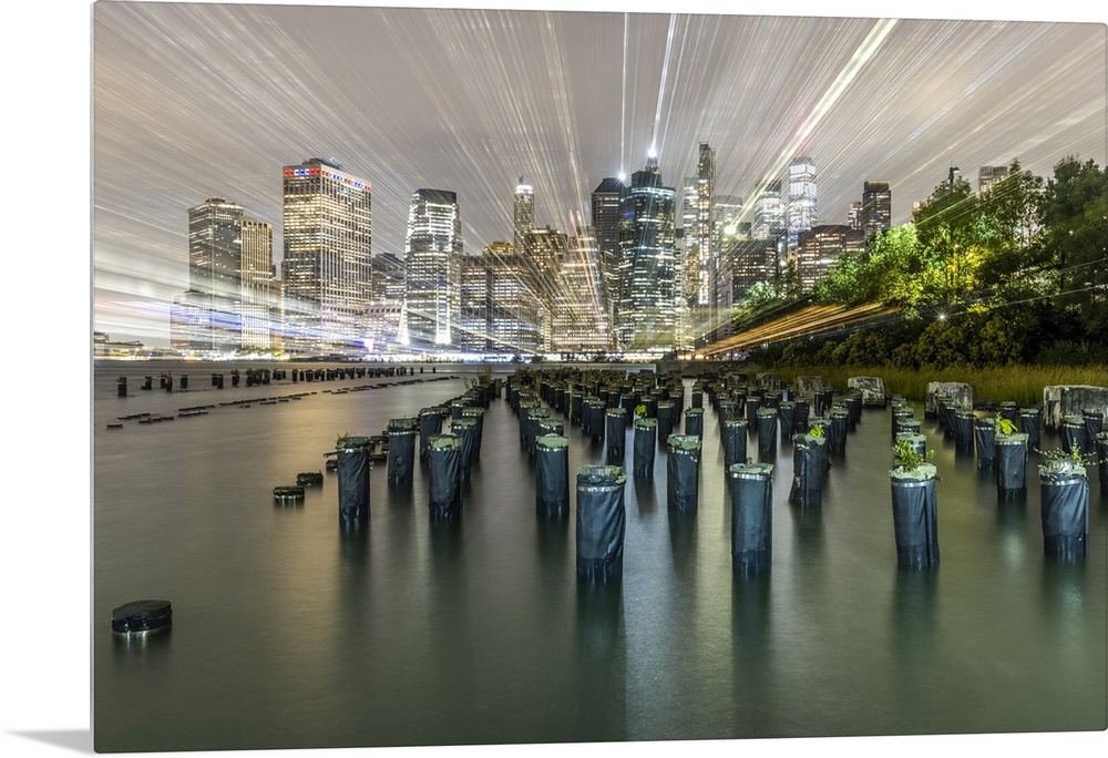 <p>USA, New York. Downtown view from Pier 1, wooden pilings in front of river in Brooklyn Heights. United States, New York.</p>