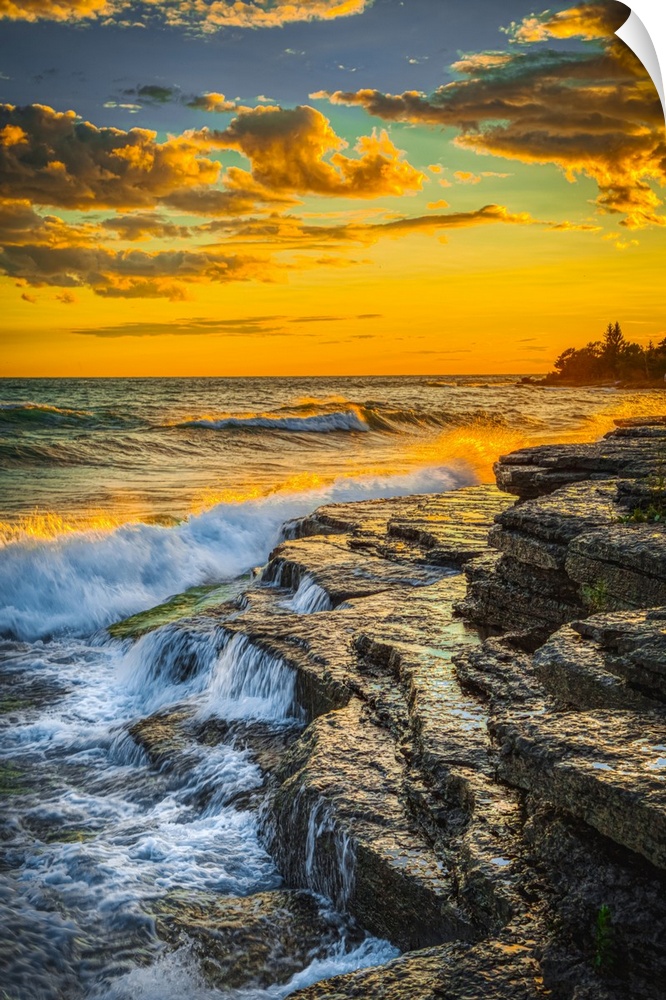 <p>USA, New York, Lake Ontario. Sunset waves on rocky shoreline. United States, New York.</p>