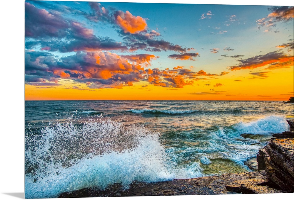 <p>USA, New York, Lake Ontario. Sunset waves on rocky shoreline. United States, New York.</p>