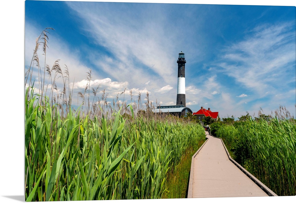 <p>USA, New York, Long Island, wooden path to the Fire Island Lighthouse surrounded by beach grass, blue sky, white clouds.</p>