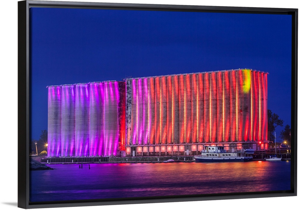 <p>USA, New York, Western New York, Buffalo, Canalside Park, renovated former industrial area, illuminated grain elevator.</p>