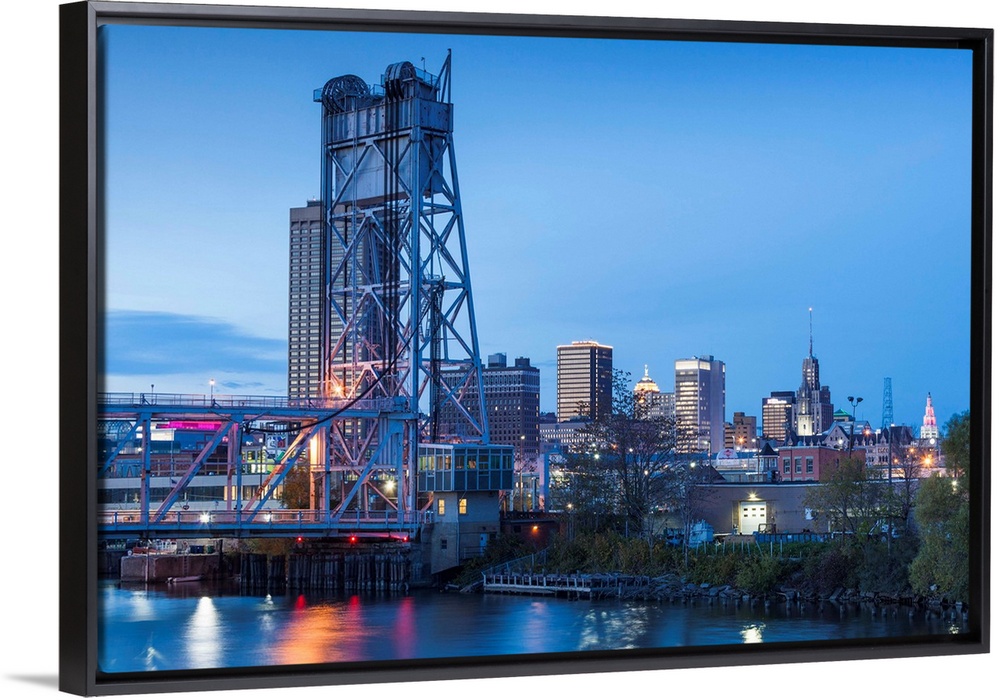 <p>USA, New York, Western New York, Buffalo, skyline and Michigan Avenue Bridge, dusk.</p>