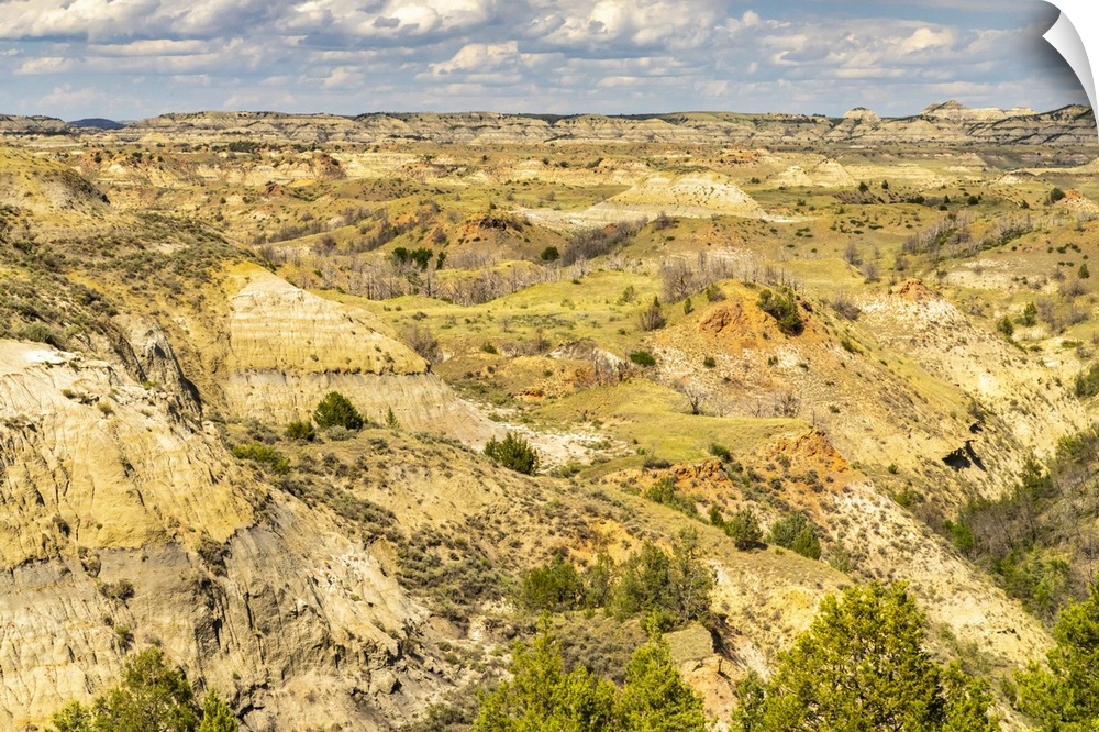 <p>USA, North Dakota, Theodore Roosevelt National Park. Overview of park eroded hill formations.</p>