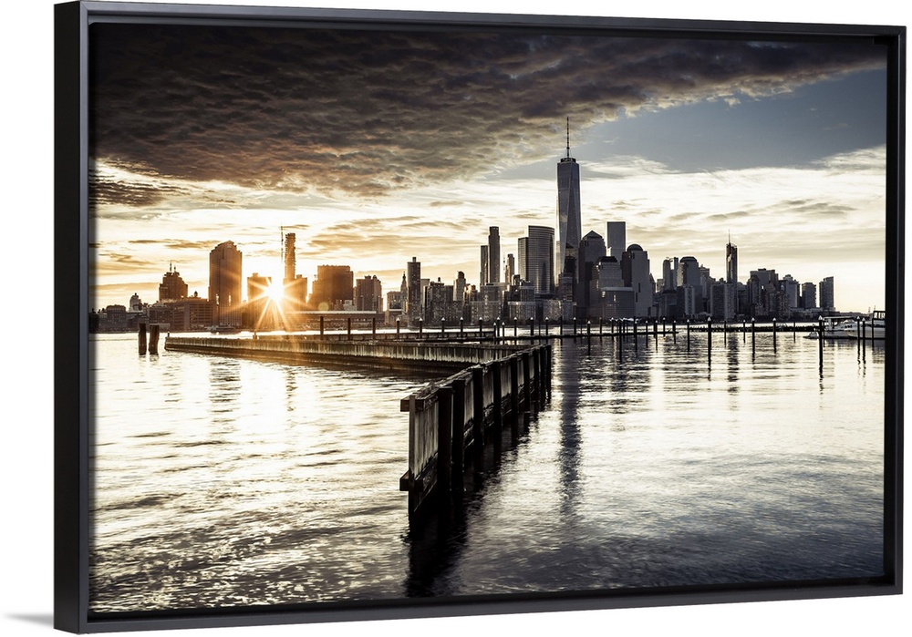 <p>USA, New York City, Lower Manhattan, Lower Manhattan skyline with One World Trade Center and Freedom Tower from New Jersey, at sunrise.</p>