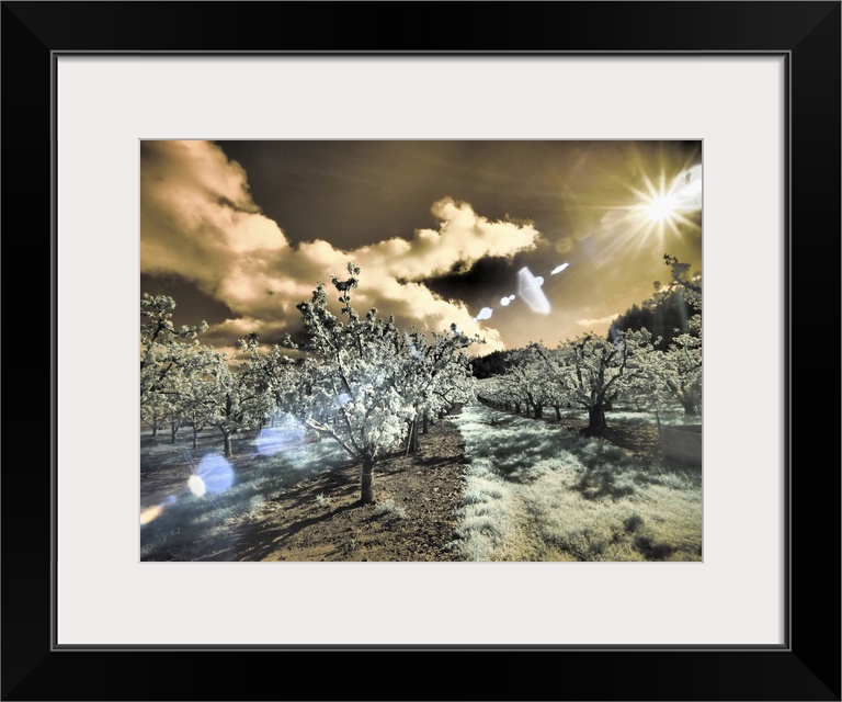 <p>USA, Oregon, Columbia Gorge. Infrared of light reflecting in spring apple orchard. United States, Oregon.</p>