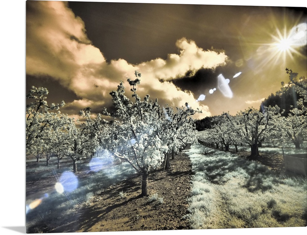 <p>USA, Oregon, Columbia Gorge. Infrared of light reflecting in spring apple orchard. United States, Oregon.</p>