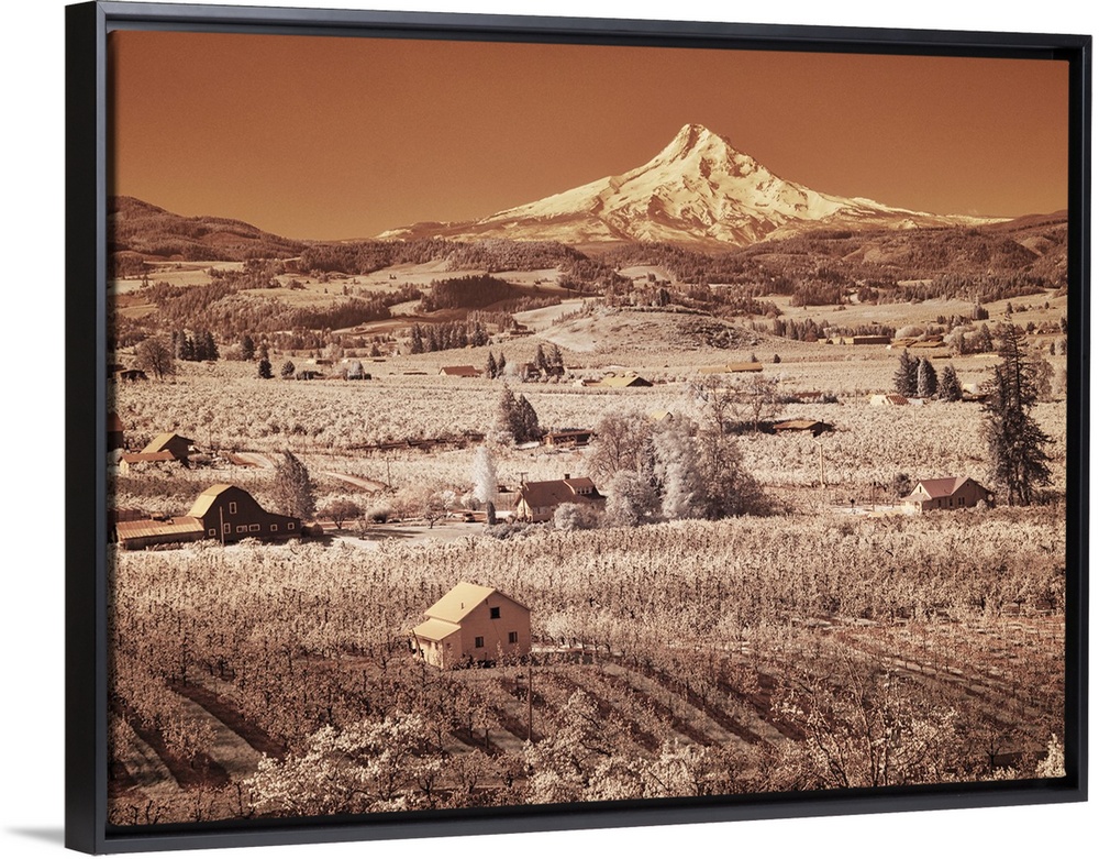 <p>USA, Oregon, Columbia Gorge. Infrared of spring orchards in bloom and Mount Hood. United States, Oregon.</p>