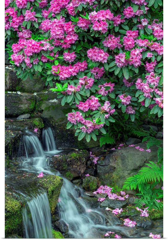 <p>USA, Oregon, Portland, Crystal Springs Rhododendron Garden, Rhododendron blooms alongside waterfall and ferns.</p>