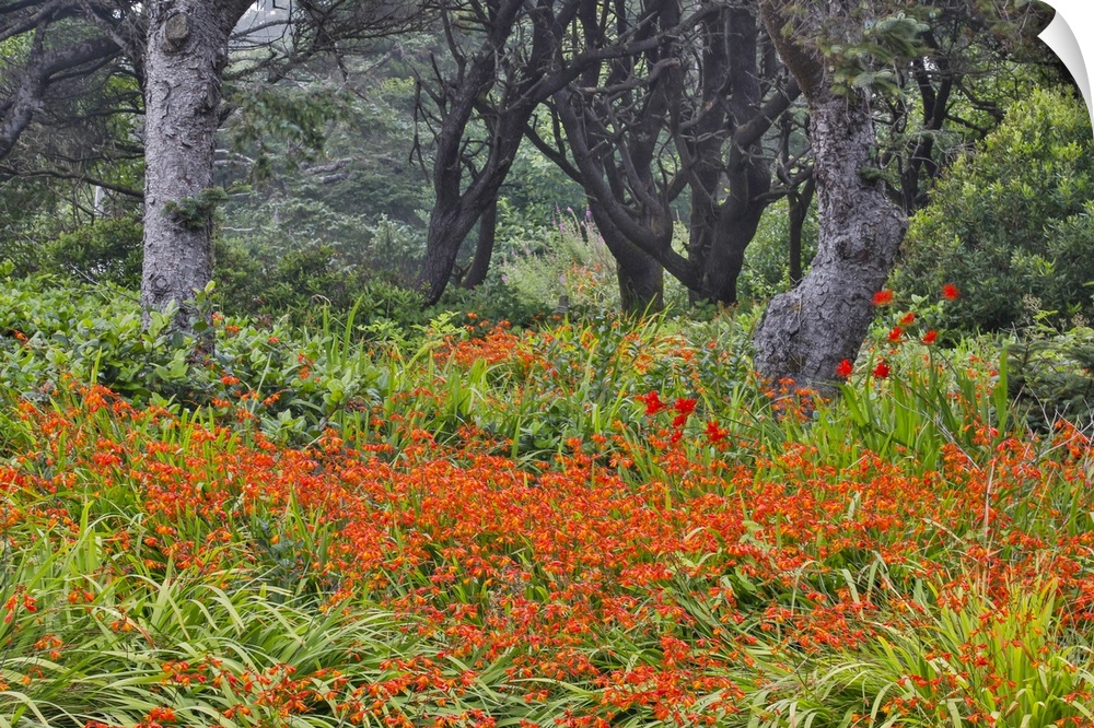 <p>USA, Oregon, Yachats. Crocosmia growing in amongst Sitka Spruce trees.</p>