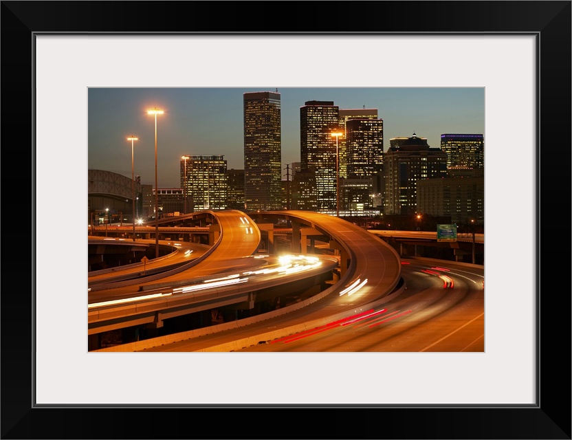 <p>Photograph of the Houston skyline taken at night with the buildings lit up and cars lights streaking by on the highway.</p>