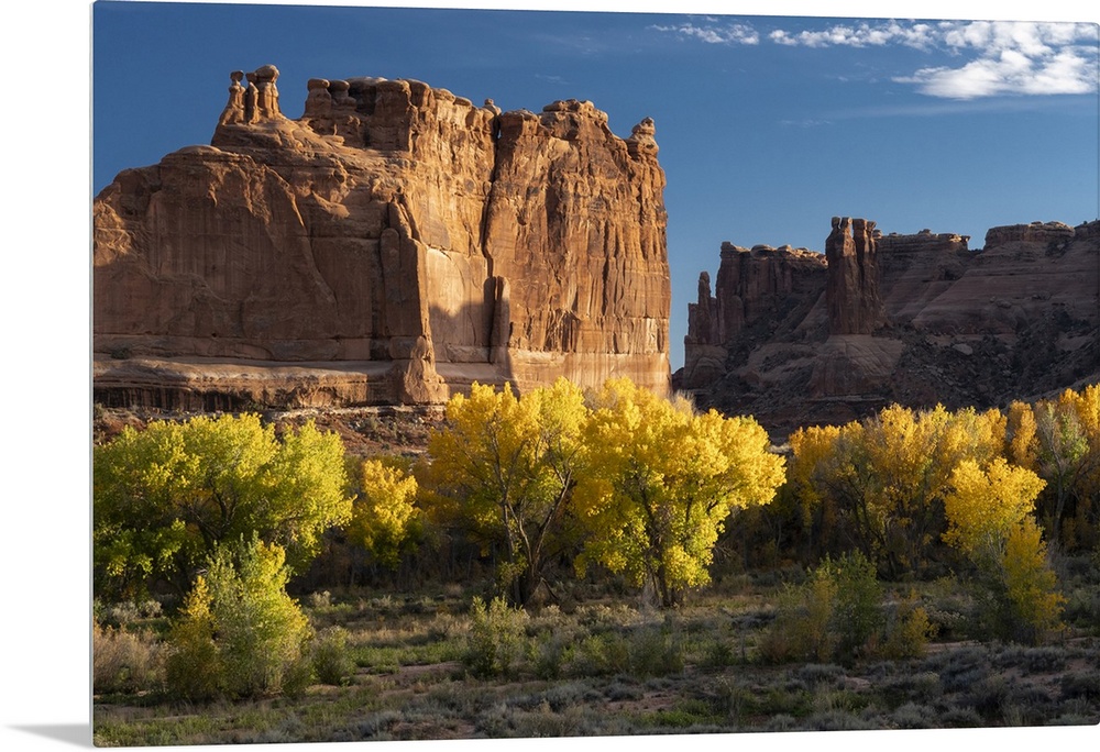<p>USA, Utah. Autumn cottonwoods and the Three Gossips at sunset, Arches National Park.</p>