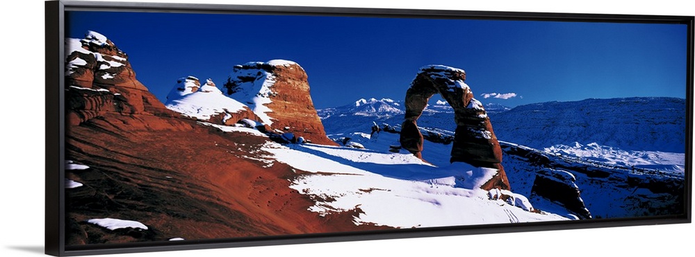 <p>Snow covers desert land and stone arches that are photographed in panoramic view.</p>