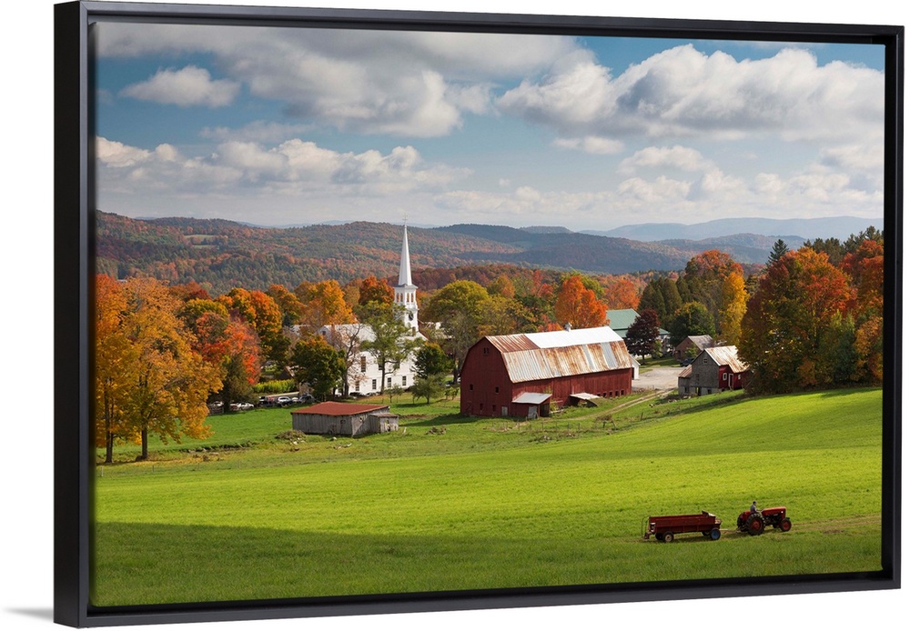 <p>USA, Vermont, Peacham, New England, Tractor passing the village in the fall.</p>