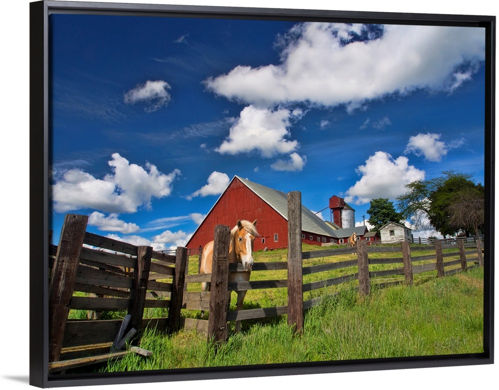 <p>North America, USA, Washington, Palouse Country, Colfax, Old Red Barn with Fence and Horse</p>