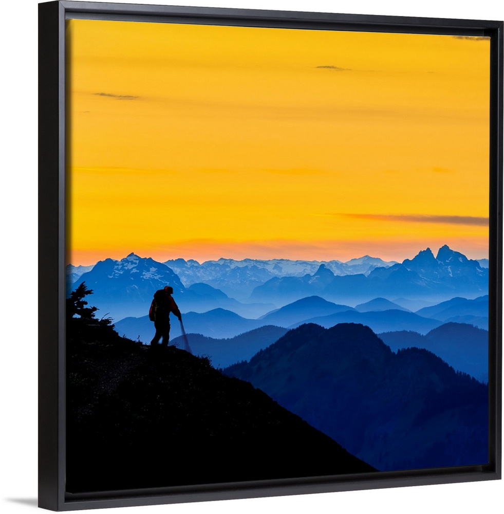 <p>USA. Washington State. A backpacker decends from the Skyline Divide in the North Cascades near Mt. Baker at sunset. Prominent peaks are Judge Howay and Robie Reid in Canada. Digital composite. (MR)</p>