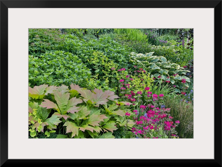 <p>USA, Washington State, Bellevue. Bellevue Botanical Garden, hosta and pink perennial primrose.</p>