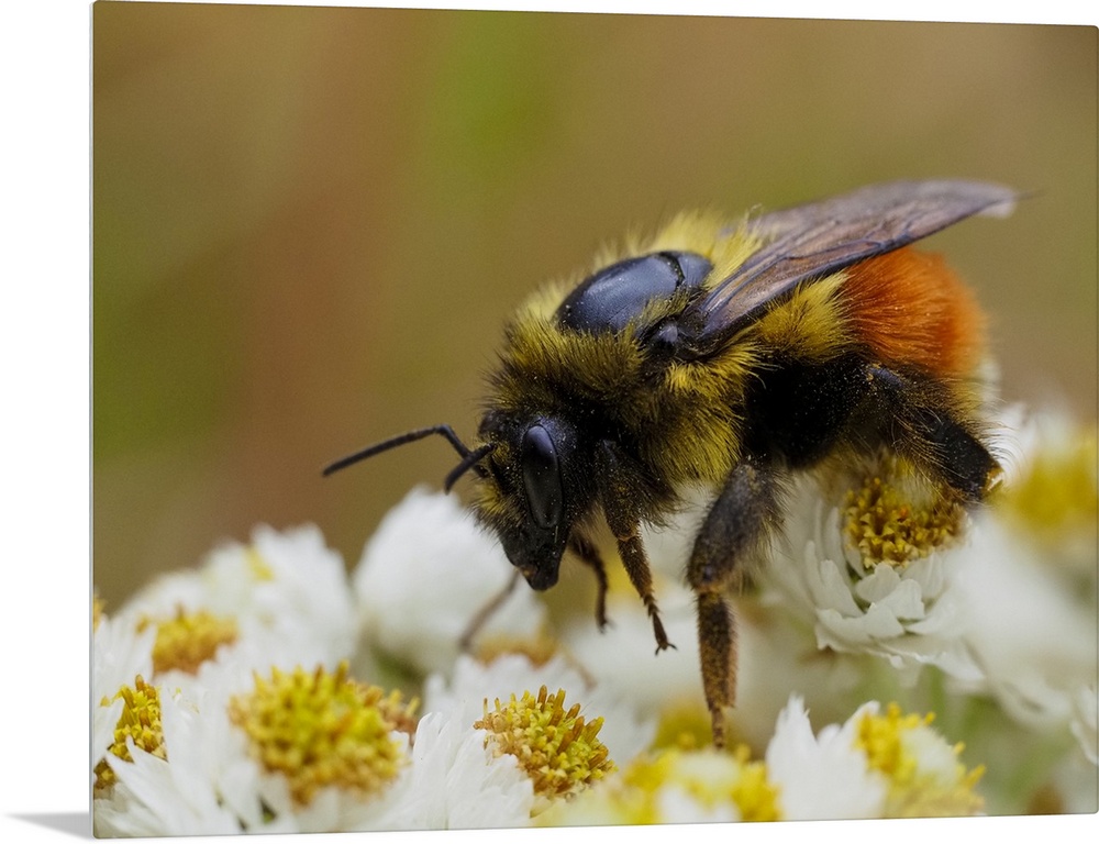 <p>Usa, Washington State, Bellevue. Honeybee covered with pollen on Pearly everlasting.</p>