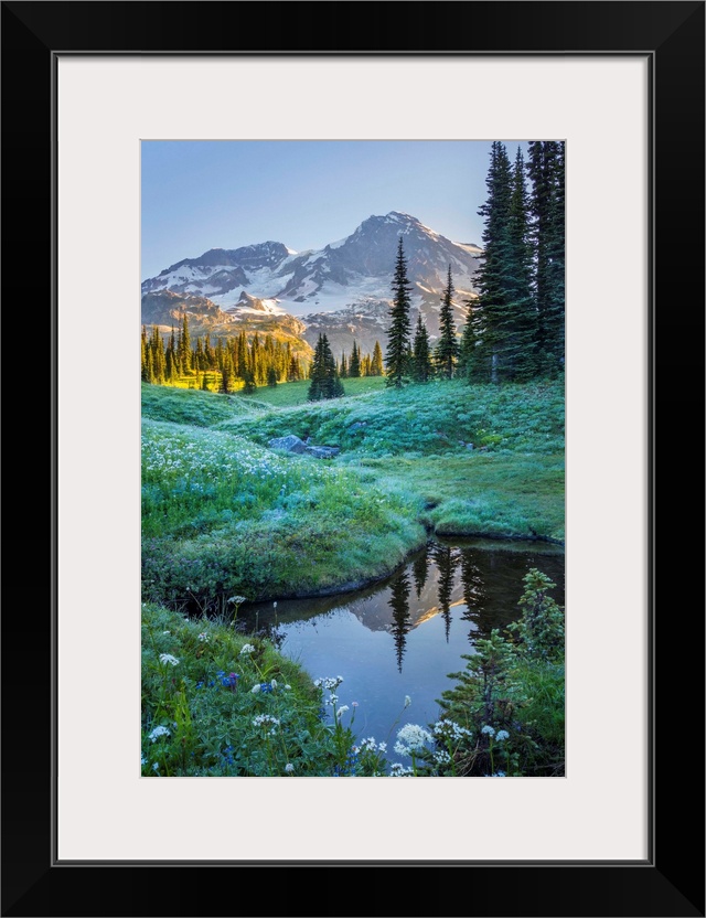 <p>USA. Washington State. Mt. Rainier reflected in tarn amid wildflowers at Indian Henry's Hunting Ground, Mt. Rainier NP.</p>