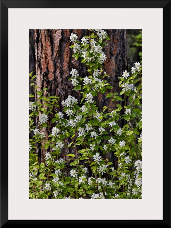 <p>USA, Washington State, Peshastin. Dirt road off of Highway 97 ponderosa pine tree trunk and white blooming bush.</p>