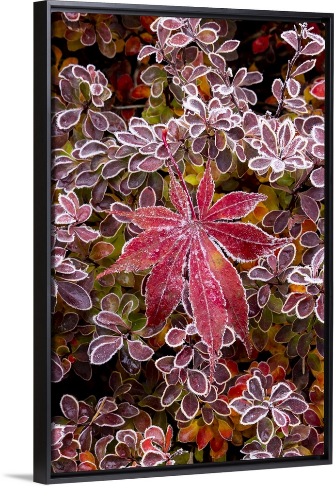<p>USA, Washington State, Sammamish. Autumn colors on frosted barberry and fallen Japanese maple Leaf.</p>