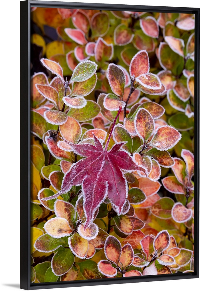 <p>USA, Washington State, Sammamish. Autumn colors on frosted barberry and fallen Japanese maple Leaf.</p>