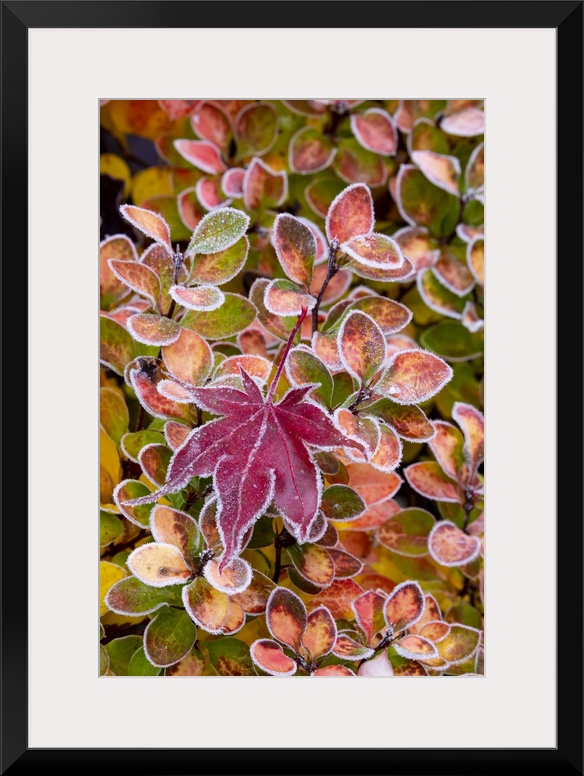 <p>USA, Washington State, Sammamish. Autumn colors on frosted barberry and fallen Japanese maple Leaf.</p>