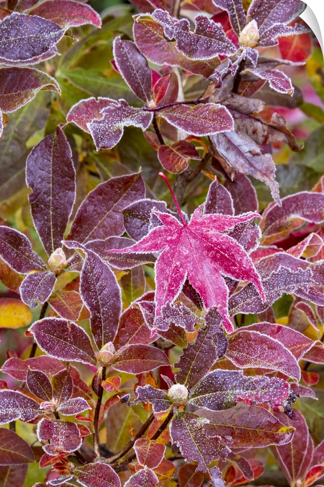 <p>USA, Washington State, Sammamish. Autumn colors on frosted Japanese maple leaves on Azalea.</p>