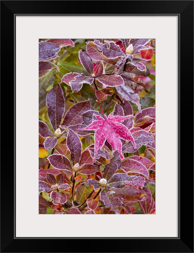 <p>USA, Washington State, Sammamish. Autumn colors on frosted Japanese maple leaves on Azalea.</p>