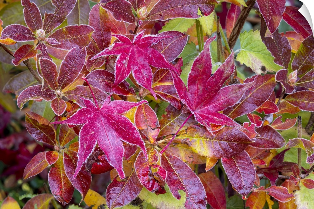<p>USA, Washington State, Sammamish. Autumn colors on frosted Japanese maple leaves on Azalea.</p>