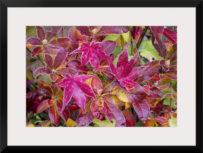 <p>USA, Washington State, Sammamish. Autumn colors on frosted Japanese maple leaves on Azalea.</p>