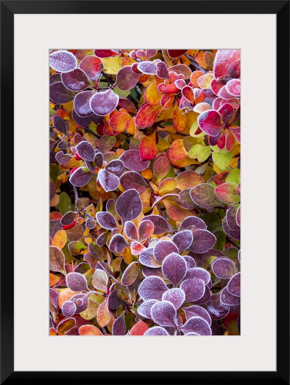 <p>USA, Washington State, Sammamish. Close-up of frosted barberry leaves in Autumn.</p>