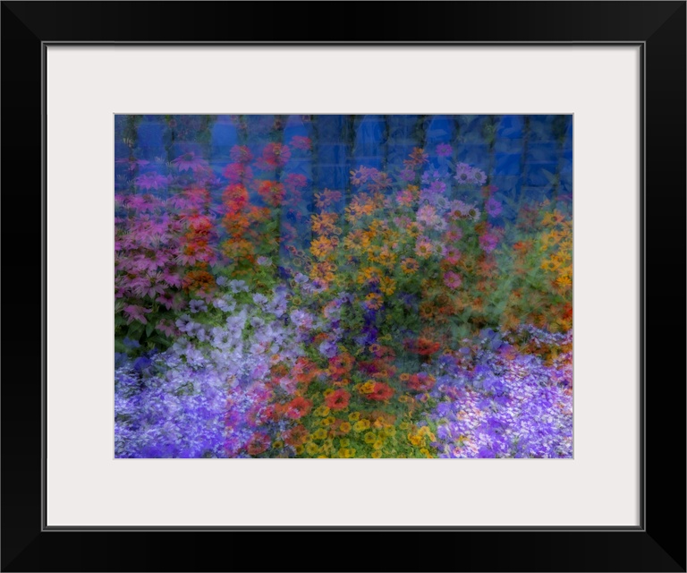 <p>USA, Washington State, Pacific Northwest, Sammamish colorful flowers and blue picket fence multi exposures. United States, Washington State.</p>
