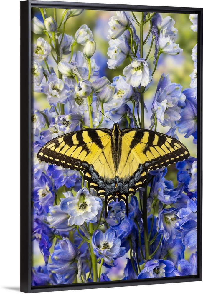 <p>USA, Washington State, Sammamish. Eastern tiger swallowtail buttery on blue flowering delphinium.</p>
