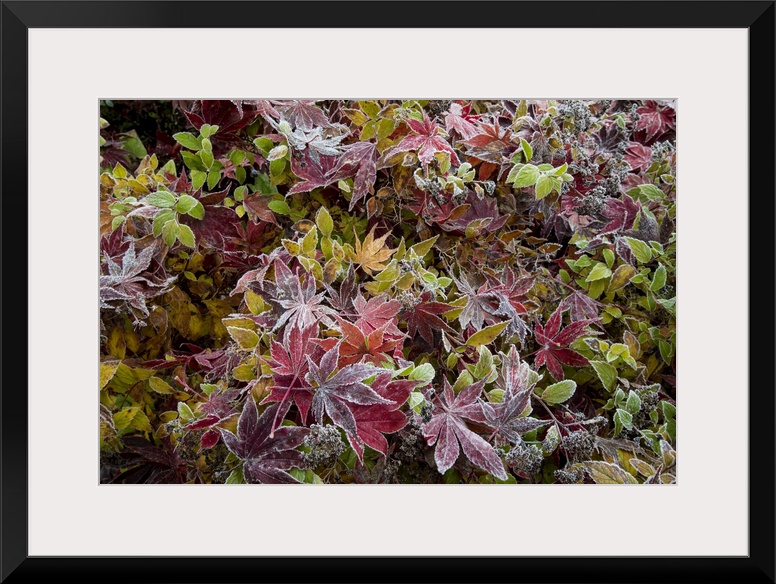 <p>USA, Washington State, Sammamish. Frosted fallen Japanese maple leaves with fall colors.</p>