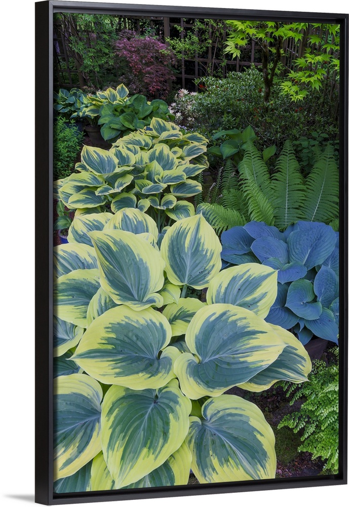 <p>USA, Washington State, Sammamish. Garden in springtime colors with hosta liberty growing in large pots.</p>