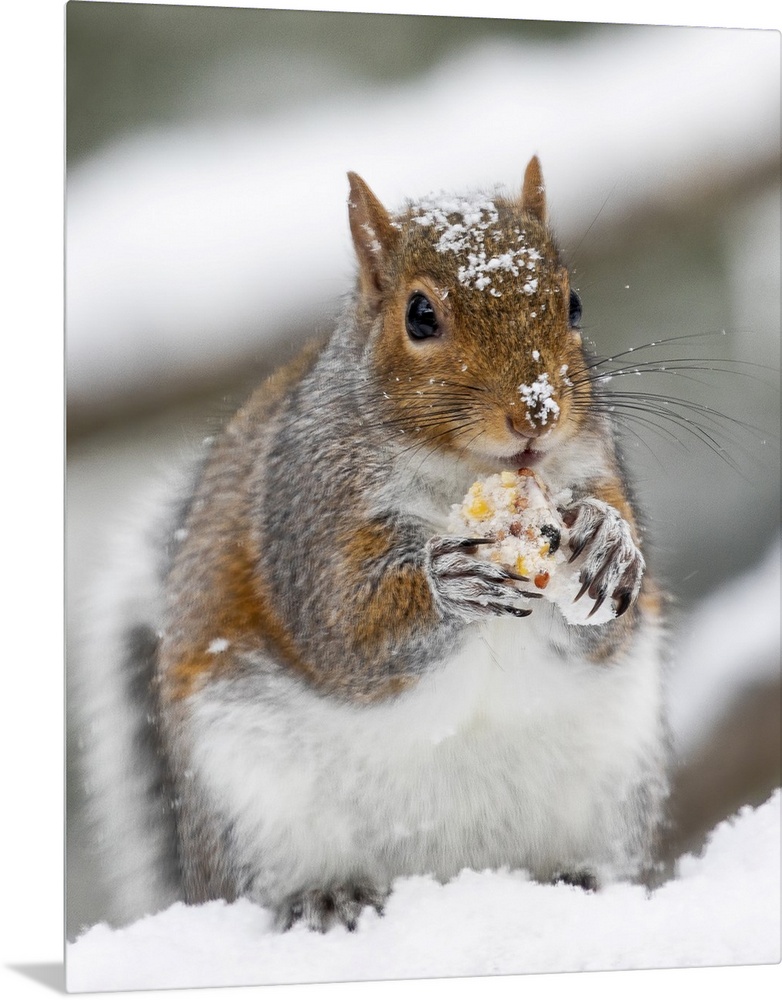 <p>USA, Washington State, Sammamish. Grey squirrel feeding in fresh snowfall.</p>