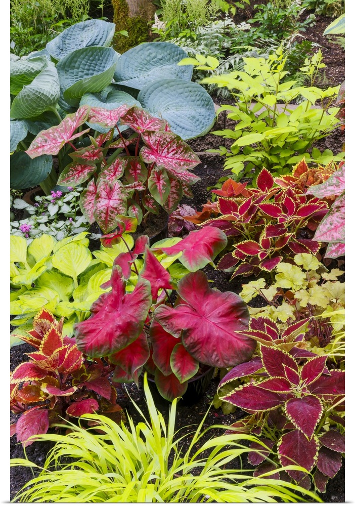 <p>USA, Washington State, Sammamish. Newly planted garden with hosta. Coleus. Caladium, Japanese Grasses.</p>