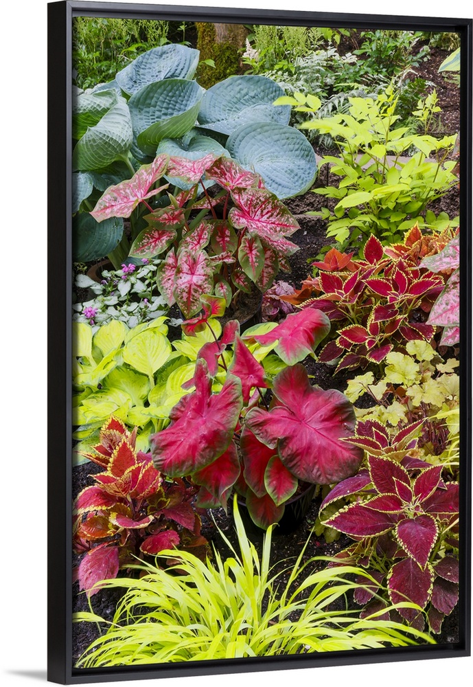 <p>USA, Washington State, Sammamish. Newly planted garden with hosta. Coleus. Caladium, Japanese Grasses.</p>