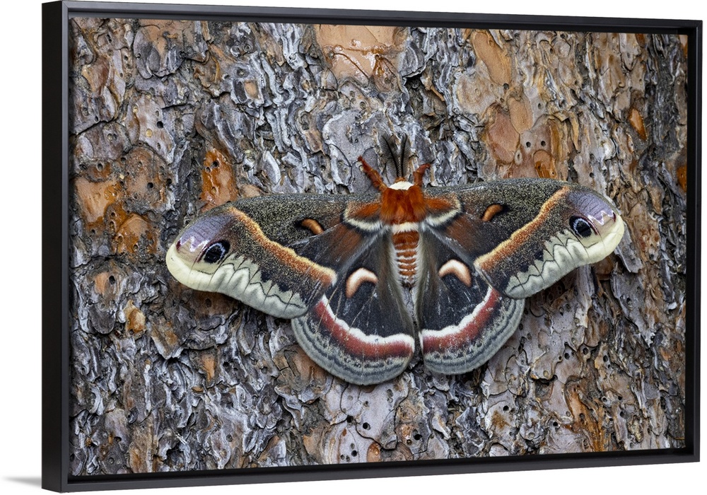<p>USA, Washington State, Sammamish. Red robin silk moth on ponderosa pine bark.</p>