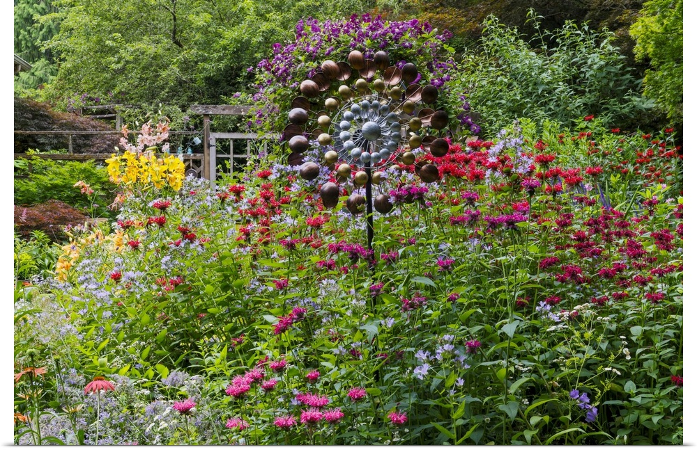 <p>USA, Washington State, Sammamish. Summer perennial flower garden with cone flowers, zinnias. Beebalms, Rebecca. Coleus, Japanese grasses and lawn art, wind wheel.</p>