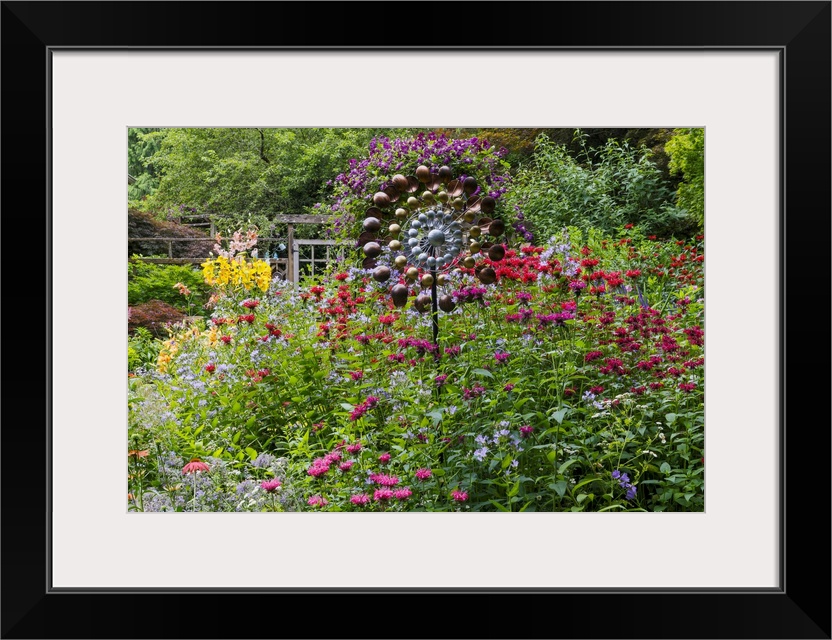 <p>USA, Washington State, Sammamish. Summer perennial flower garden with cone flowers, zinnias. Beebalms, Rebecca. Coleus, Japanese grasses and lawn art, wind wheel.</p>