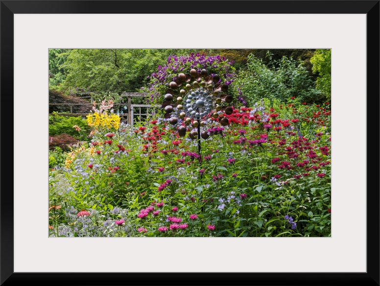 <p>USA, Washington State, Sammamish. Summer perennial flower garden with cone flowers, zinnias. Beebalms, Rebecca. Coleus, Japanese grasses and lawn art, wind wheel.</p>