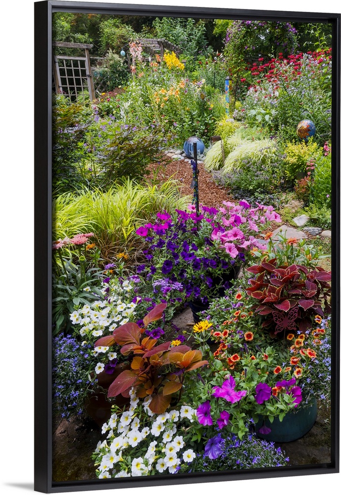 <p>USA, Washington State, Sammamish. Summer perennial flower garden with cone flowers, zinnias. Beebalms, Rebecca. Coleus, Japanese grasses and lawn art.</p>