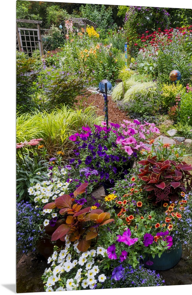<p>USA, Washington State, Sammamish. Summer perennial flower garden with cone flowers, zinnias. Beebalms, Rebecca. Coleus, Japanese grasses and lawn art.</p>