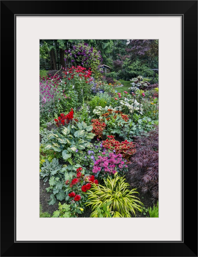 <p>USA, Washington State, Sammamish. Summer perennial flower garden with cone flowers, zinnias. Beebalms, Rebecca. Coleus, Japanese grasses and lawn art.</p>